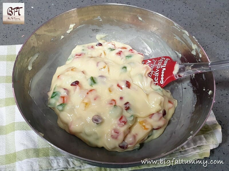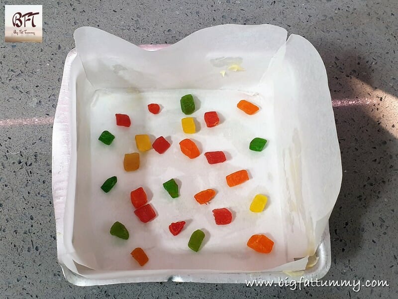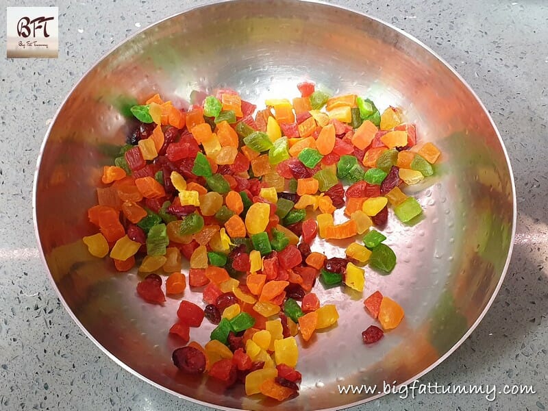 Step 1:     Cut the candied fruit into small cubes and keep aside in a bowl.