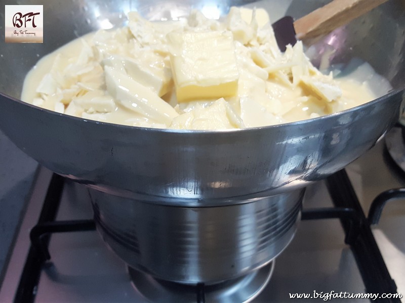 Step 2: Take another vessel such that the bowl with the ingredients sits on its edges. Heat some water in this vessel and let it come to a boil. Then lower the heat so that the water simmers. Place your bowl with the ingredients on the pot (to make a double boiler). Your chocolate will start to melt almost immediately. Stir continuously with a silicon spatula for about 3 minutes till all the chocolate melts and forms a homogenous mixture.