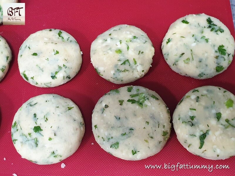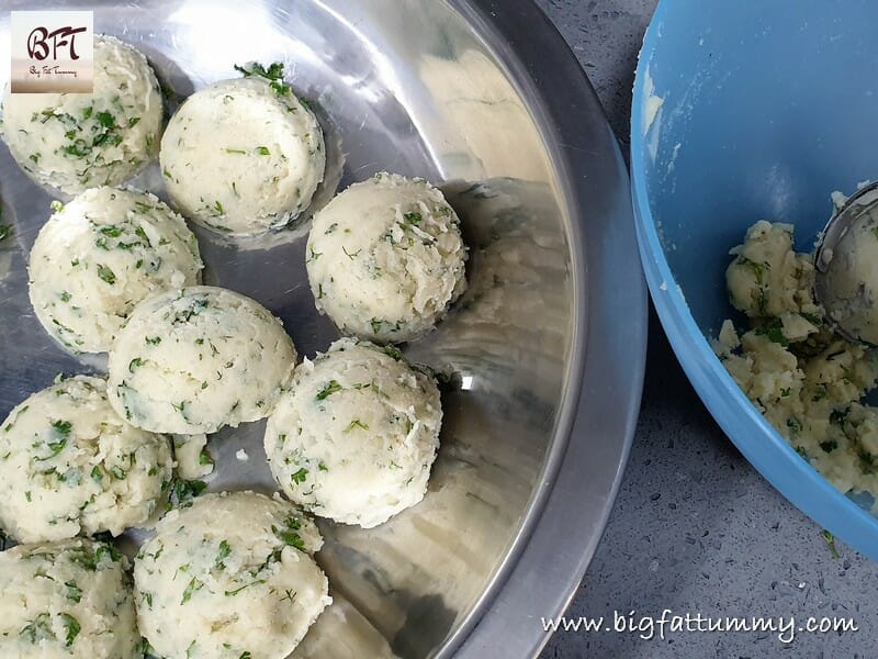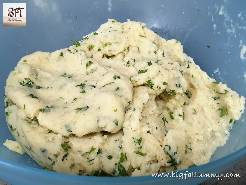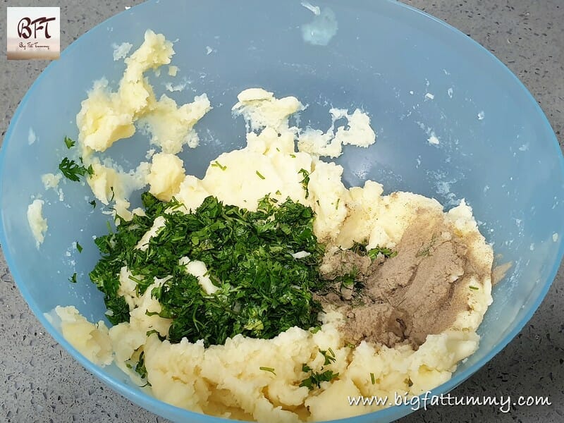 Step 3: Next add the pepper powder or red chilly flakes (I use pepper), chopped green corriander and ½ tsp. salt. Knead well and then divide the potato mash into 12 equal portions.