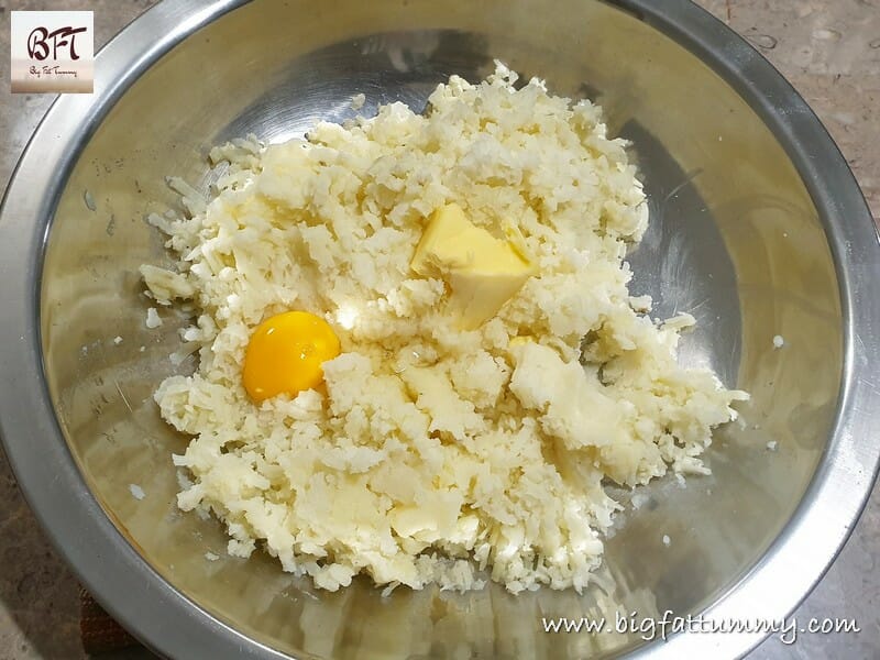 Step 4: Remove / strain the cooked potatoes and place them on a large plate. Grate the potatoes whilst still hot / warm. Add the butter, salt and egg yolk and then knead the grated potatoes with your knuckles so that there are no lumps and a smooth dough / mash is formed.