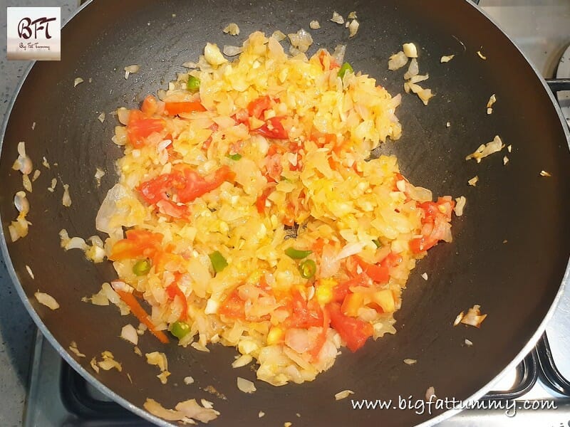 Step 1: Heat the oil in a pan and sauté the onion, garlic and green chillies on medium heat till the onions turn soft. Add the tomatoes and turmeric powder and cook for 5 minutes.