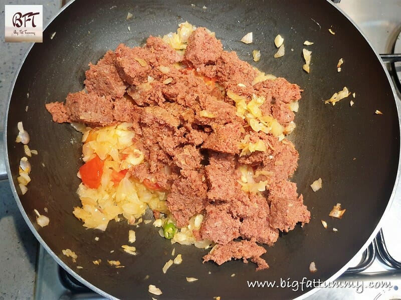 Step 2: Add the corned beef. Mash and sauté for 2 minutes. Add ½ tsp. salt and cook covered for 3 to 4 minutes on low heat. Then open the lid and add the vinegar. Mix and continue cooking till most of the moisture dries out (don’t dry it too much). Add the pepper, mix and keep aside.
