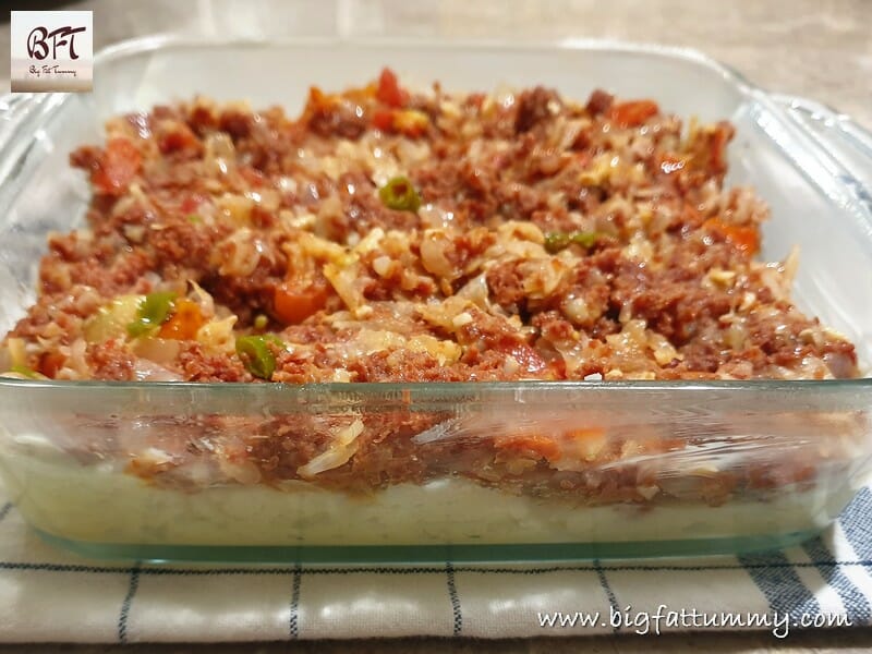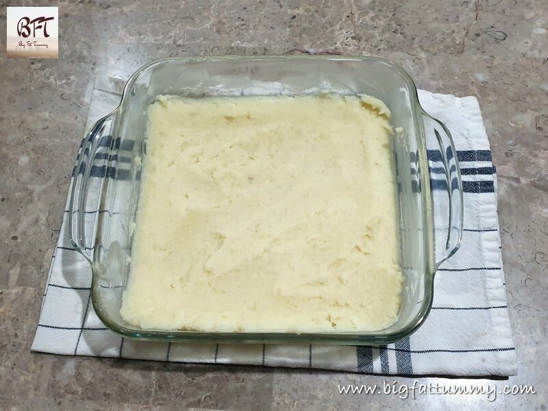 Step 6: Divide the potato mash into two portions and use one portion to line the bottom of the baking dish.