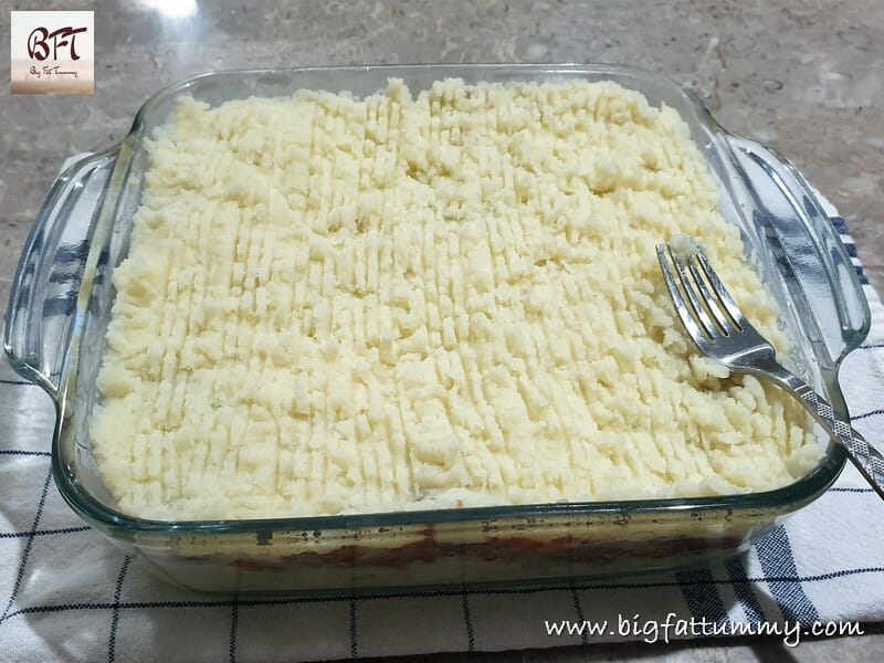 Step 8: Then top with the remaining potato mash. Spread evenly and make a design with the fork as show in the picture. Brush the top with the egg yolk. (you can choose to bake it right here or move to the next step)