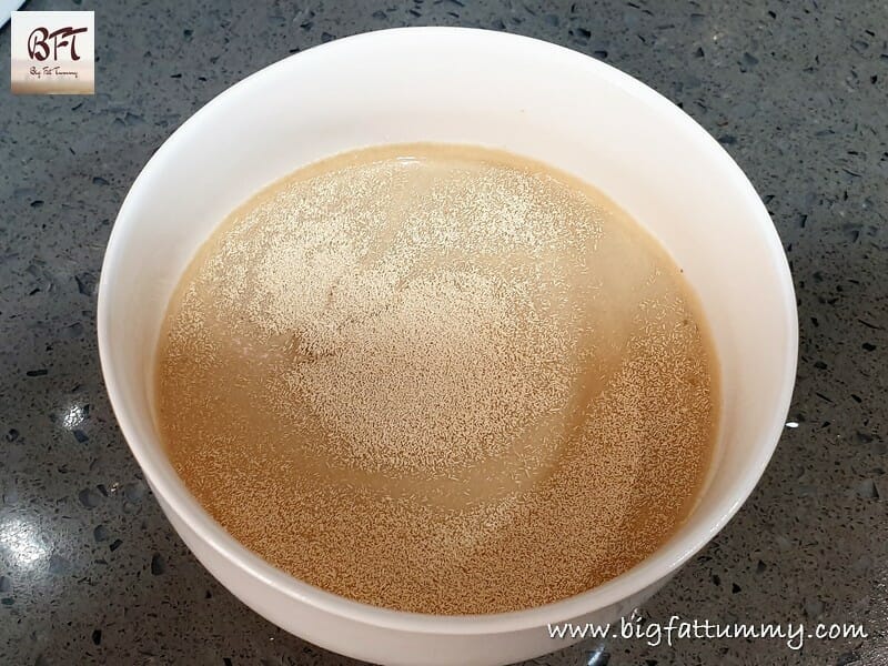 Take 200 ml lukewarm water in a bowl (not hot, or the yeast will die). Add the 3 tbsp. of sugar and mix. Then sprinkle the yeast into the bowl. Mix lightly and cover the bowl and keep aside in a warm place till it is frothy (10 minutes or so). The mixture has to be frothy. If it is not, that means your yeast is not active and you cannot use it.