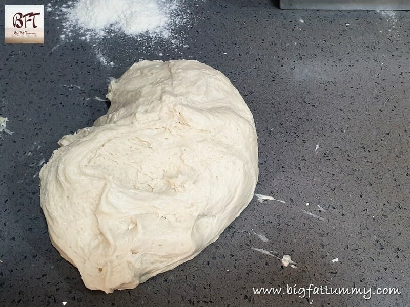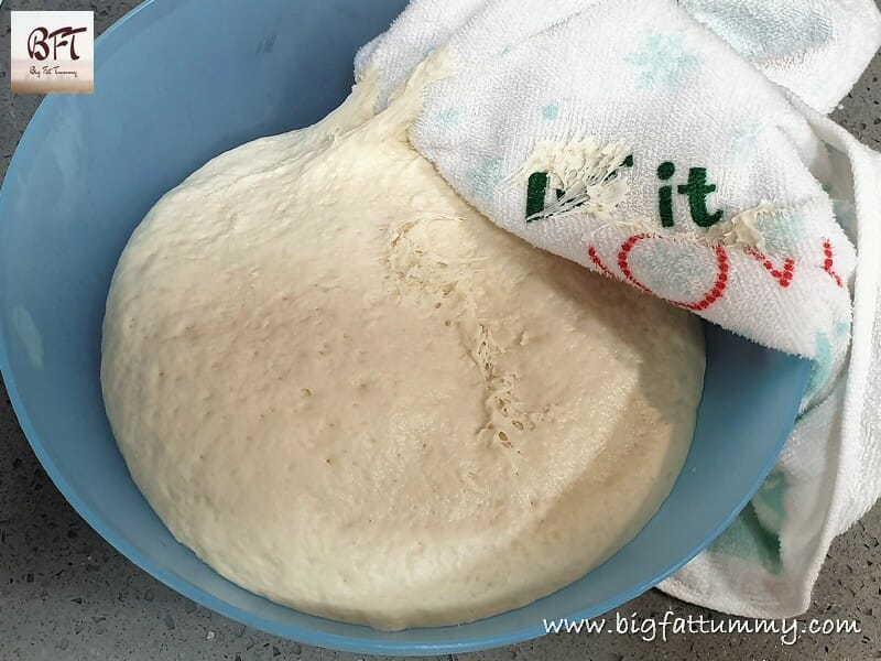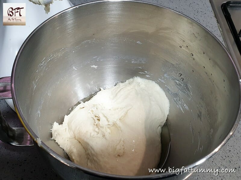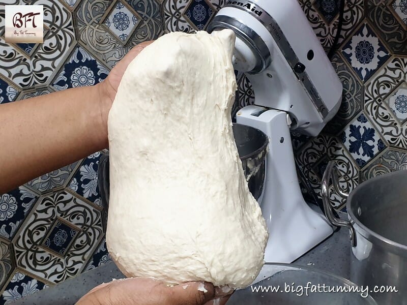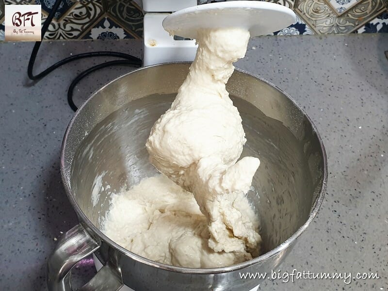 Oil your palms and take the dough out of the mixer bowl. The dough will be sticky and stretchy. Form a ball and transfer to a large bowl / vessel (see tip 2 below). Apply a very thin layer of oil on the top. Cover the bowl with a wet cloth and keep aside in a warm place for 1 ½ to 2 hours to rise.