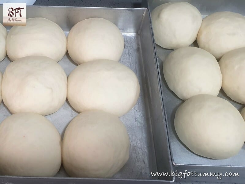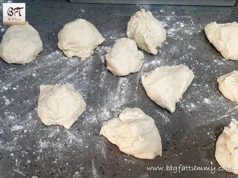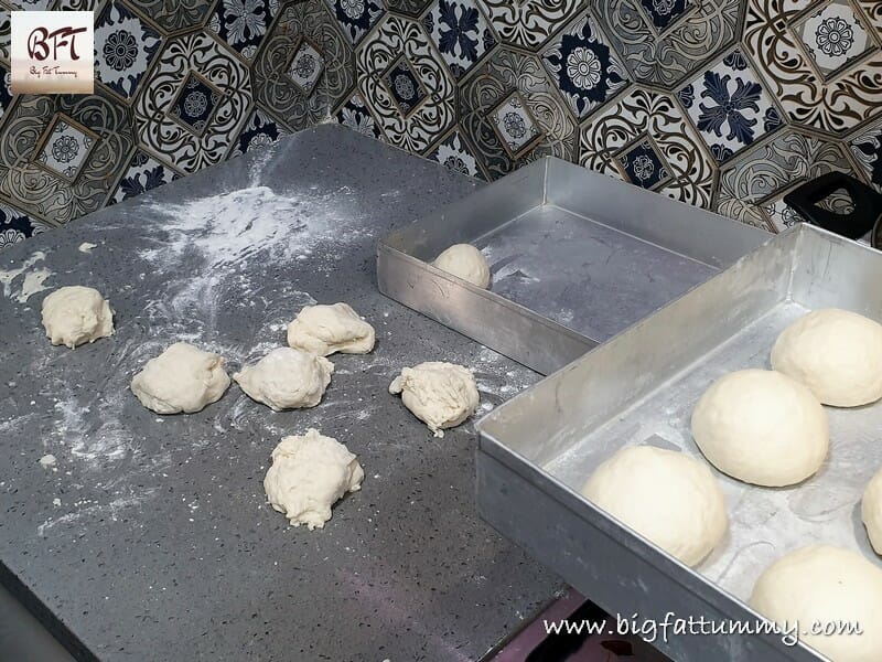 D). Dust you hand with the flour at the corner of the platform / bench and then take a portion of the dough and flatten it on the platform. Tuck in the edges of that portion of dough and then form into a ball either on the platform or on your palm using the thumb and fingers of your other hand. Place this ball on your greased baking tray. Do this for all the portions of dough. (Remember to dust you hand, and the kitchen platform with flour after you form each ball) Place the balls on the tray about ½ to ¾ inch apart.