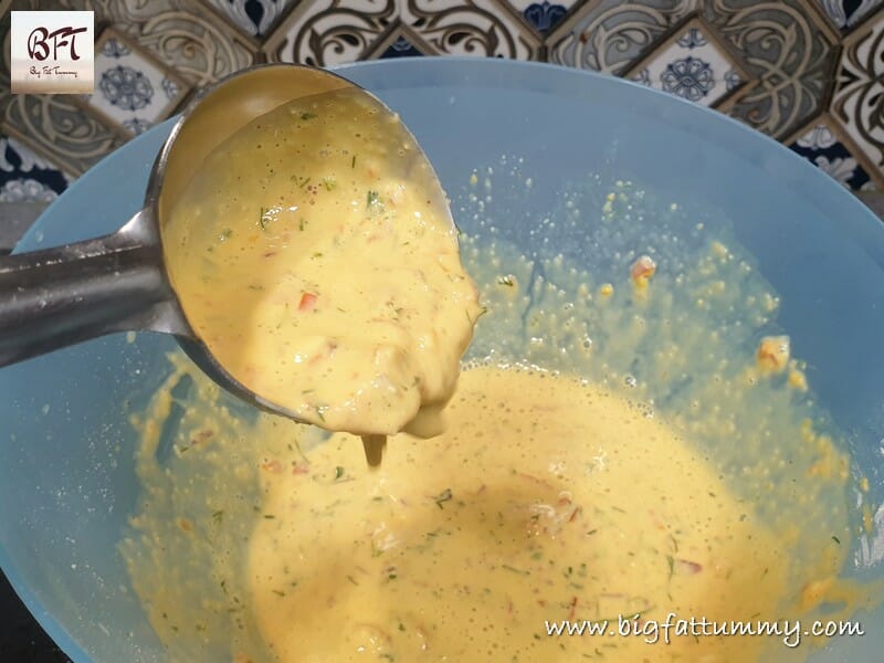 Step 1: Take all the ingredients except the oil in a bowl and add about 1/3 cup (80 ml) water. Mix and make a batter (it should have no lumps, like a dosa batter). Keep aside for 15 minutes.