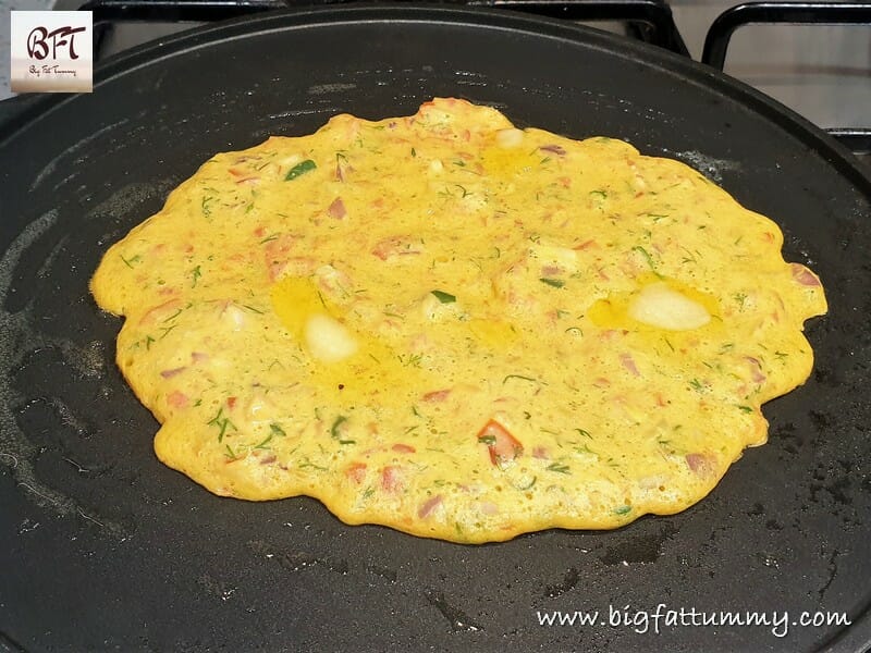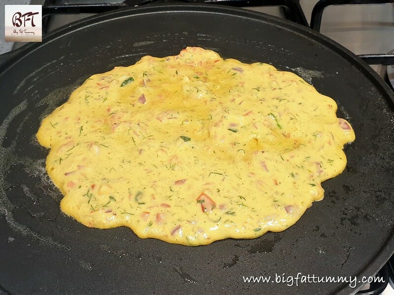 Step 2: Heat a frying pan and pour a ladleful of the mixture on the center of the pan and spread outwards in a circular motion. Cook for 2 minutes on low heat. Drizzle some oil (½ tsp.) along the edges and continue cooking for another 3 minutes.
