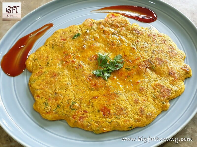 Tomato Omlette / Besan Cheela / Chilla is a very easy to make snack and uses a very few ingredients. It is made with besan (gram flour). You can serve it with tomato ketchup and toasted bread or even in a sandwich. For a recipe of homemade Hot and Sweet Ketchup (click here)