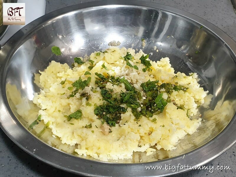 Step 3:     Meanwhile, take the potato mash in a bowl and add to it the chopped green chillies, green corriander and mint leaves (I’ve added a little less of the green herbs than mentioned in this recipe as I did not have a lot – Covid-19 Lockdown!). Also add the grated ginger, crushed garlic, chaat masala and 1 tsp. of salt. Mix well and divide into 8 to 10 portions and make a ball of each and keep aside.