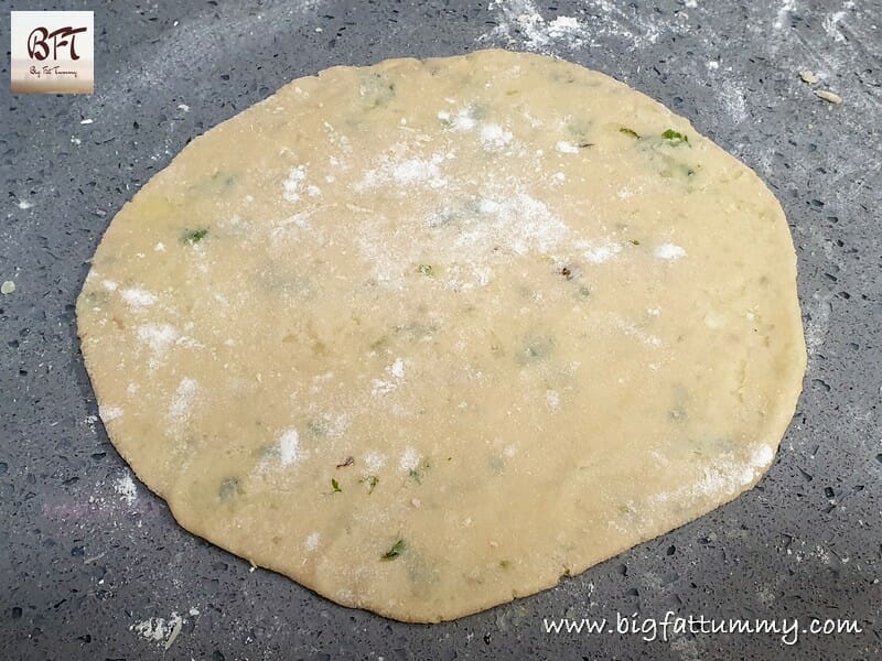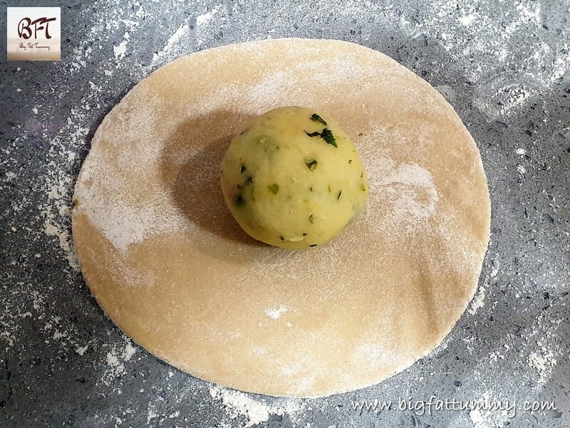 Step 6:     Then place one of the potato mash balls on it and bring the edges of the rolled dough together to cover the potato mash ball and then seal it by pressing together. Then flatten this ball and dip in some dry flour and roll it out once again (be gentle) into a circle of about 6 inches diameter (The paratha should be a little thick).