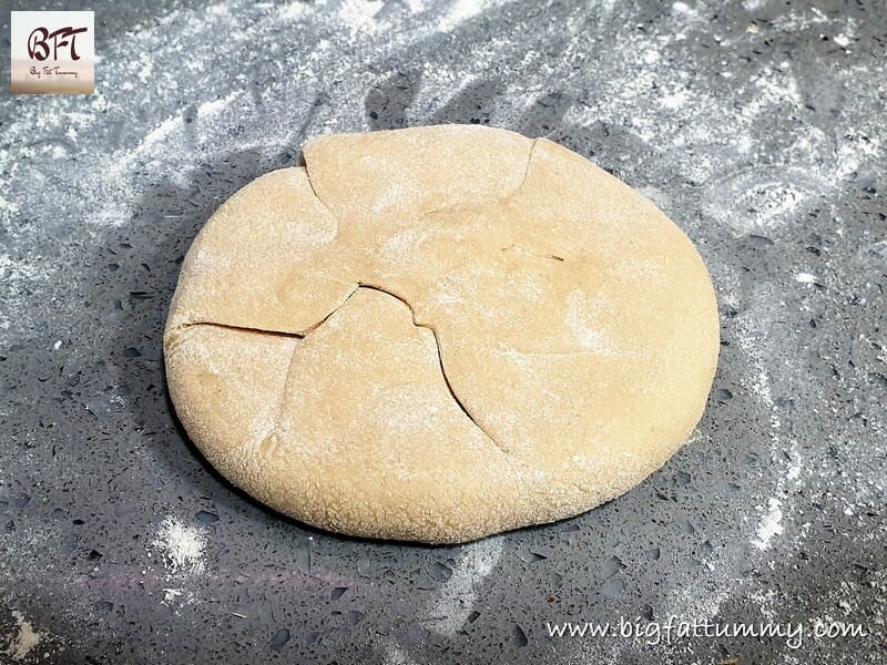 Step 5:     Take some dry flour in a bowl. Take a ball of dough and dip in the dry flour and press to flatten. Then place the flatted dough ball on a rolling board or platform and roll out so that the dough flattens and spreads evenly to a 4-inch circle (dip in the dry flour or sprinkle some dry flour in between to avoid the dough sticking to the board or pin).