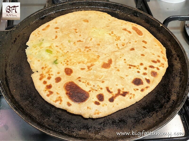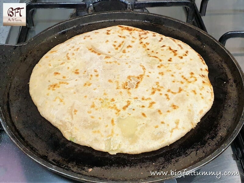 Step 5:     Place a griddle on heat and when hot place the paratha onto it. Cook for a minute on high heat and then lower the heat and flip the paratha. Apply ghee on the cooked side. Continue cooking whilst turning them over carefully (so as not to break them open) every few seconds till well fried.