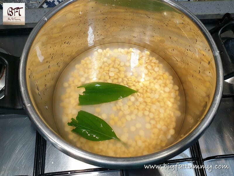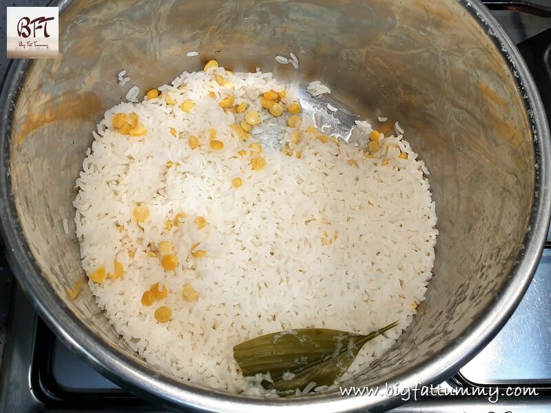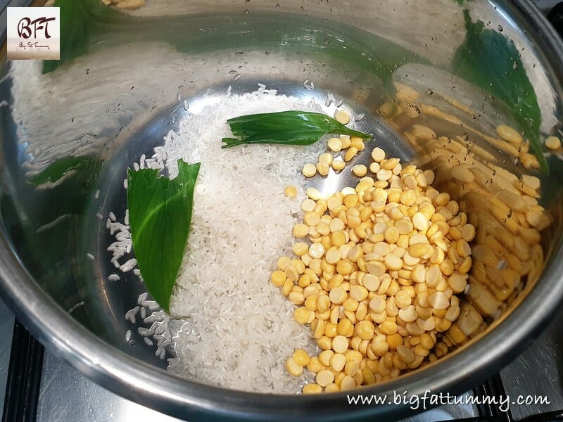 Step 2: Wash and drain the rice and add to a pressure cooker. Drain the dal and add to the same pressure cooker along with the turmeric leaves, salt and 2 cups of water. Place on heat and pressure cook for two whistles on high heat. Then switch off the heat and let the pressure release naturally.