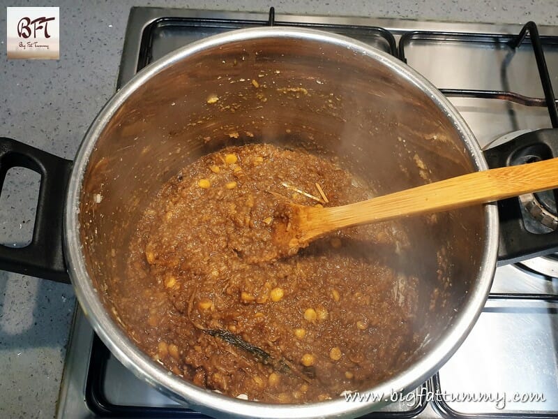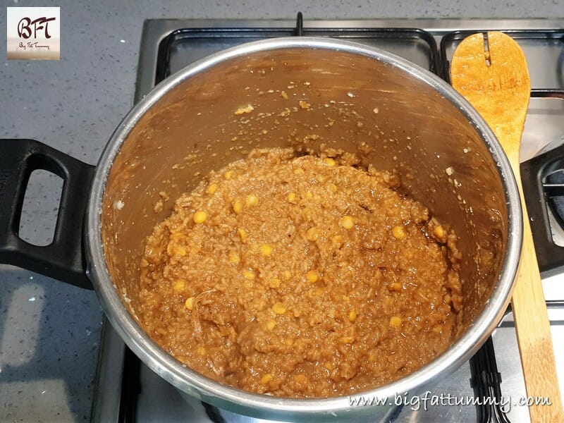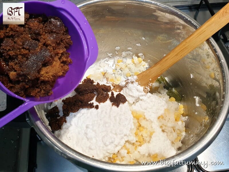 Step 4: Later, open the pressure cooker and add the coconut and grated jaggery and turn on the heat. Cook on low heat whilst stirring continuously until the mixture starts leaving the side of the cooker (see pics below). Add the cardamom powder, mix and cook for another 2 minutes.