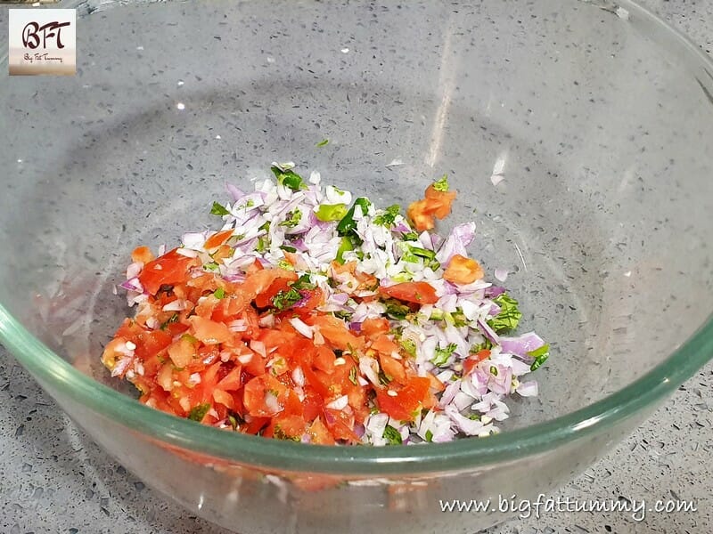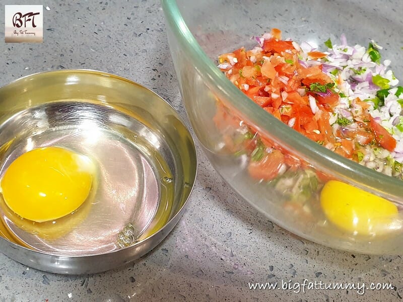 Step 2: Take the chopped onion, tomato, green chillies and green corriander in a bowl and add the salt and eggs and whisk (Tip : I break one egg at a time and add so as to check if the egg is good and then add).