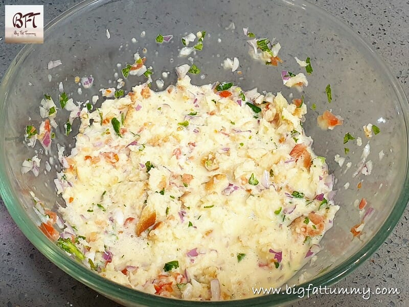 Step 3: Next add the milk and mix again. Then add the bread pieces and mix again (add a little more milk if you feel the mixture is too dry).