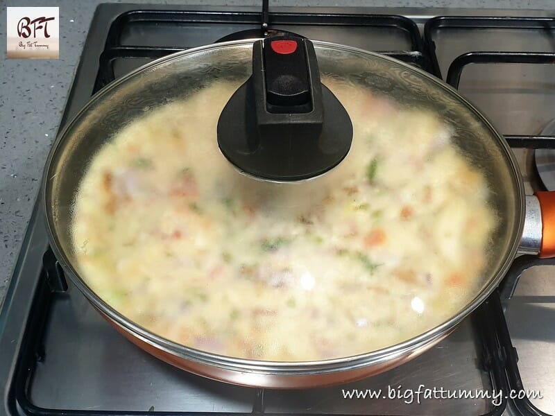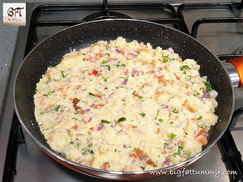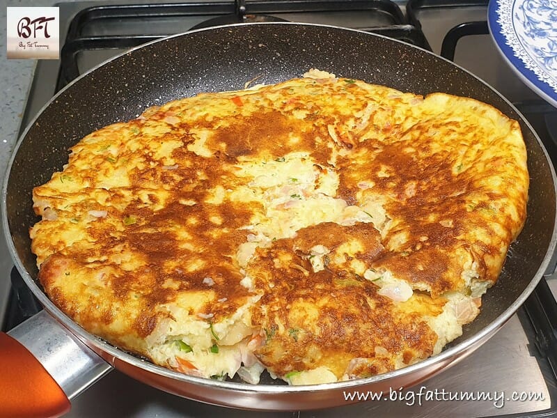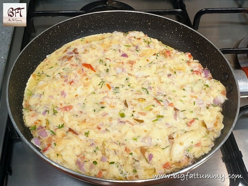 Step 4: Heat the oil in an eight-inch non-stick pan and pour the mixture into it. Spread evenly and cook covered on medium heat for about 3 to 4 minutes. Then shake the pan and see if the omelet moves (that means it’s cooked on one side).