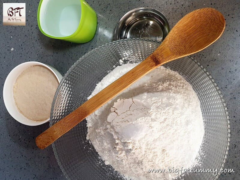 Step 2: Take the flour and salt in a bowl and give it a mix (use the backside of a wooden spoon).