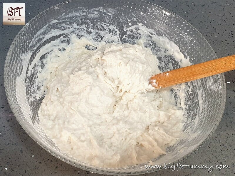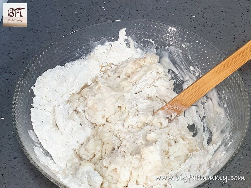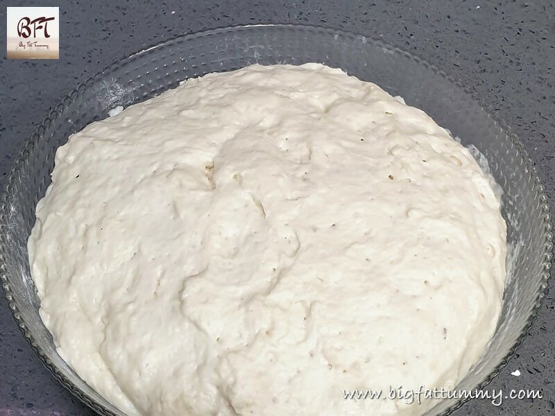 Step 3: Now add the activated yeast mixture, 275 ml lukewarm water, the oil and mix well to form a sticky dough. Cover the dough with a wet towel and leave in a warm place for 1 ½ hour.