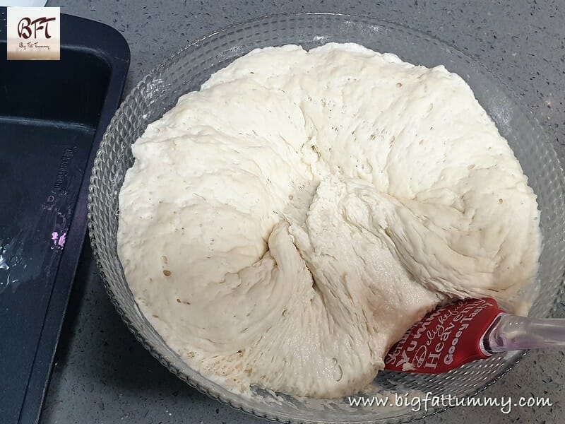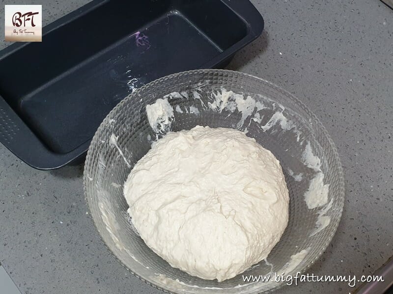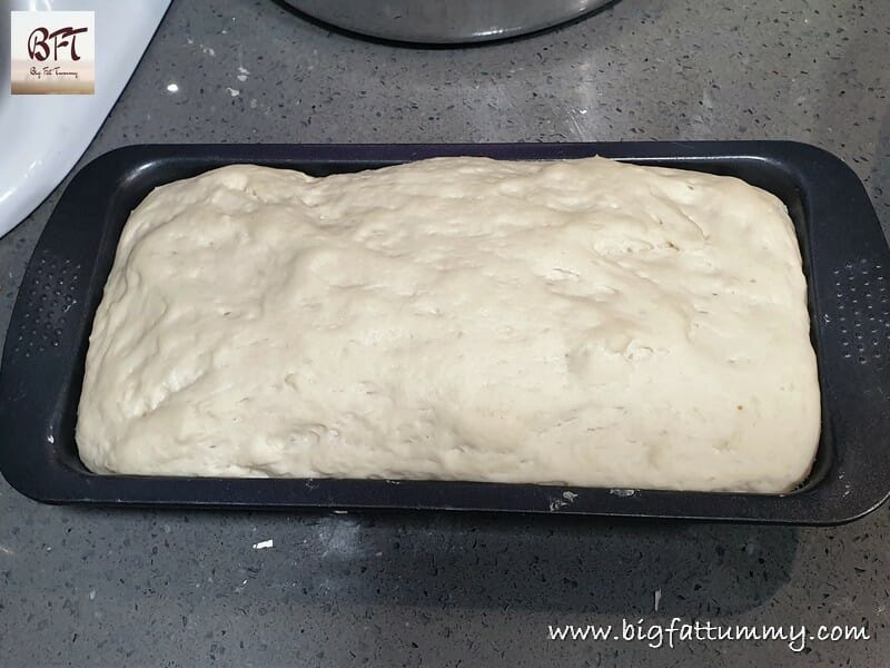 Step 6: Grease your palms with oil and lift the sticky dough and drop into the loaf tin. Spread the dough as evenly as you can to cover the entire surface of the tin using greased fingers. Keep aside to rise for another 60 minutes (see picture)