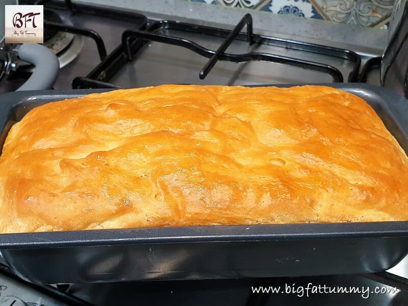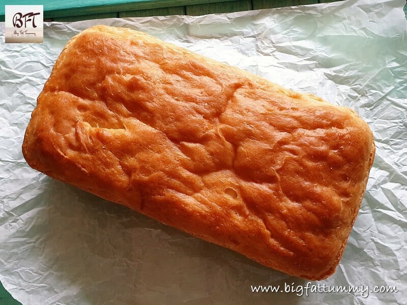 Step 7: Pre-heat an oven to 200° C for 20 minutes and then bake the loaf on the center rack for 45 minutes. Remove from the oven and brush with butter till the crust looks shiny. Allow to cool completely before you de-mould. De-mould and wrap in a clean dry cloth. Slice and use as needed.