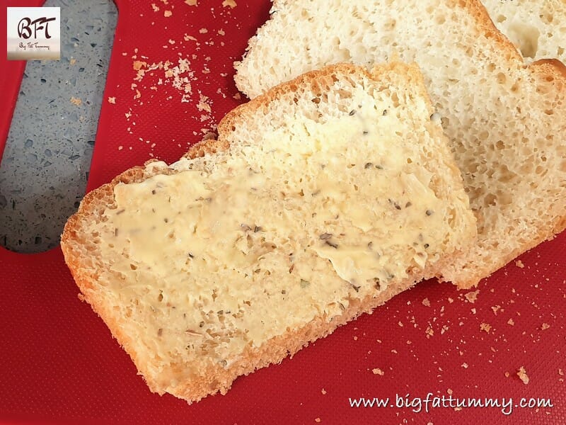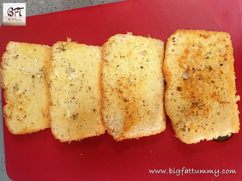 Step 4: Place a pan on heat and toast the bread slices, buttered side down, for a few minutes on medium high heat till crisp (only the buttered side). Then take off the pan.