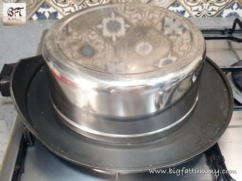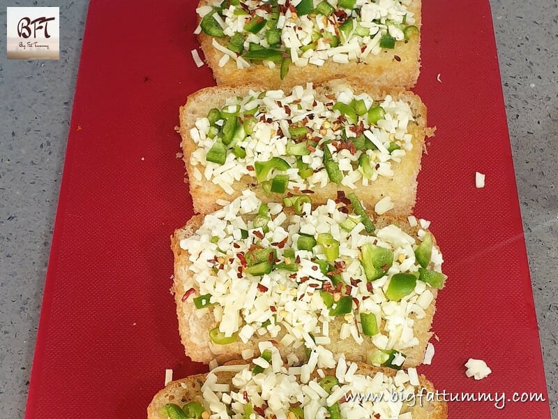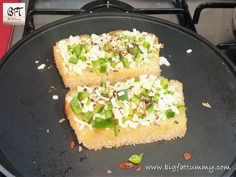 Step 6: Take a non-stick tawa / griddle and place the topped slices on it. Cover and cook for 8 to 10 minutes on low heat till all the cheese melts and the base is crisp (use a cover, such that it does not touch the cheese topping). If using the oven, bake at 180° C for 6 to 8 minutes.