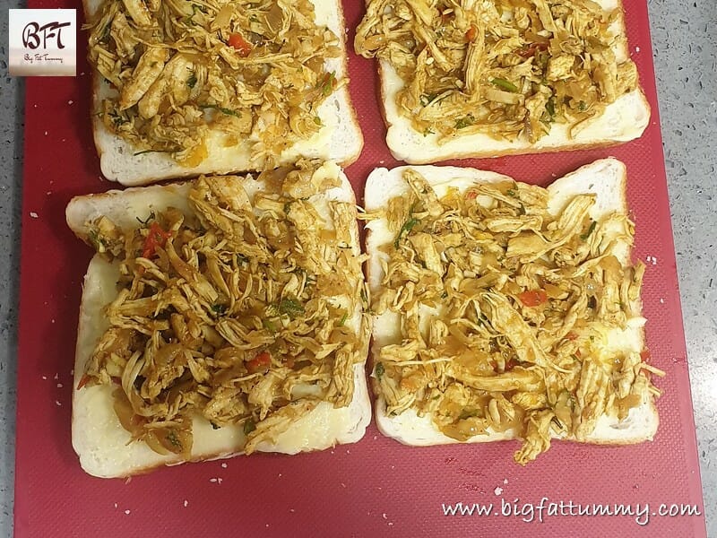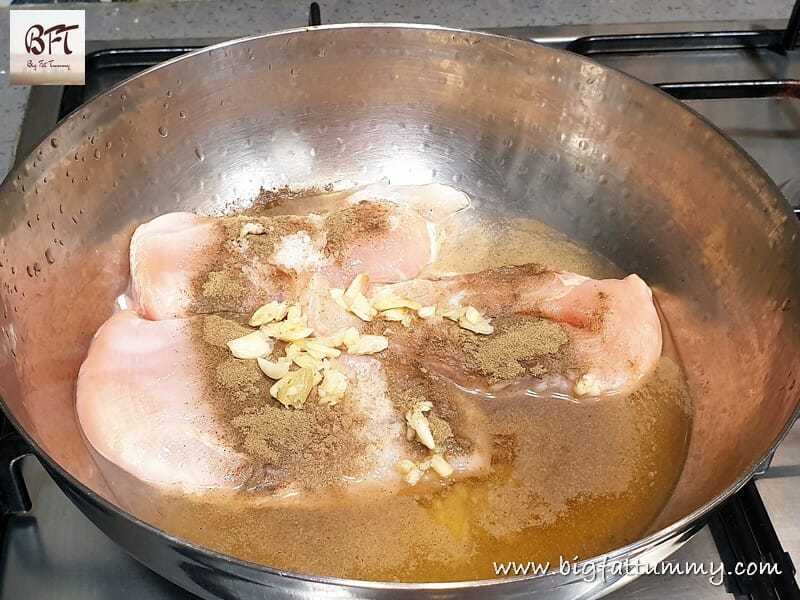 Step 1: Wash and drain the pieces of chicken breast. Transfer to a pan and add ½ cup water. Add 1 tsp. salt, black pepper powder and the crushed garlic and cook till the breast is cooked and the water dries up (about 10 to 15 mins.). Then allow to cool.