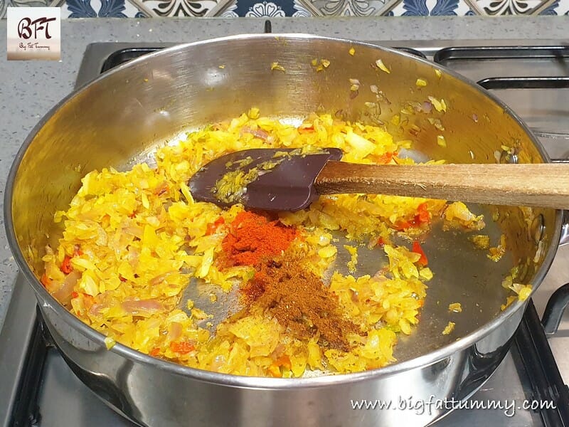 Step 4: Add the green chillies and sauté for a minute. The add the turmeric, red chilly, clove and garam masala powders and cook for 30 seconds on low heat.