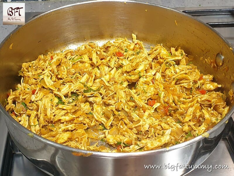 Step 5: Add the shredded chicken, sugar, ¼ tsp. salt and 2 tbsp. of water, mix and cook covered for 2 minutes. Add the corriander and mix. Switch off the heat.