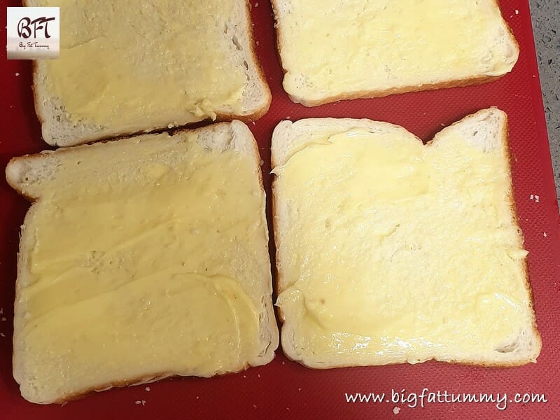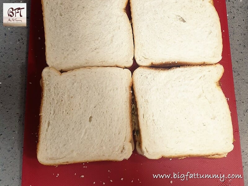 Step 6: Apply butter to one side of your slices. Then spoon some of the chilly fry onto it. Cover with another slices of bread (buttered on one side or unbuttered). Press down on the slice lightly to compress a bit. Then cut diagonally to form two triangles. Serve with tomato ketchup (for a Homemade Tomato Ketchup, click here)