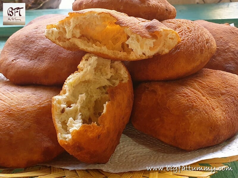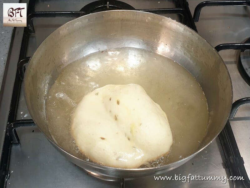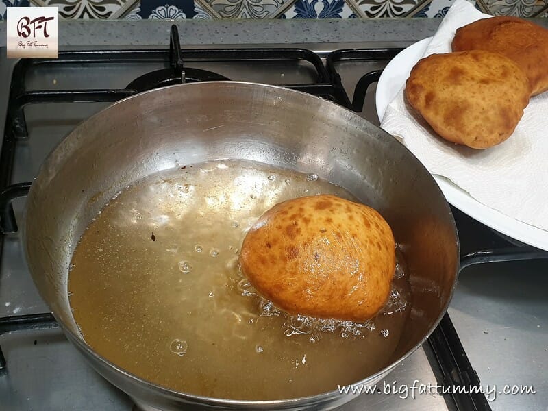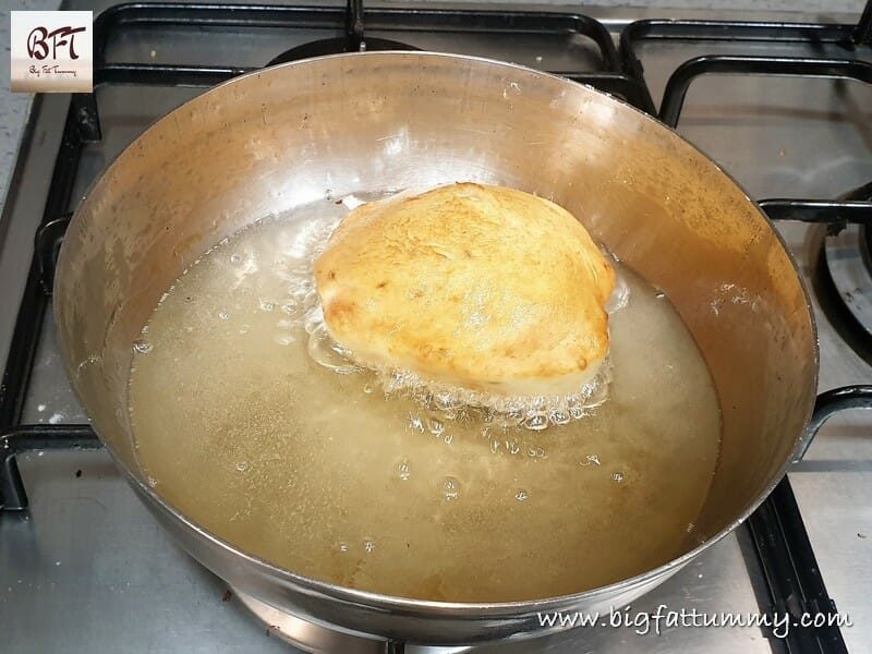 Step 6: Roll out thick discs (about 3 ½ inch diameter) of each portion of the dough balls and when the oil is hot deep fry the buns one at a time till golden brown on medium heat (be careful while frying as they tend to darken very soon).