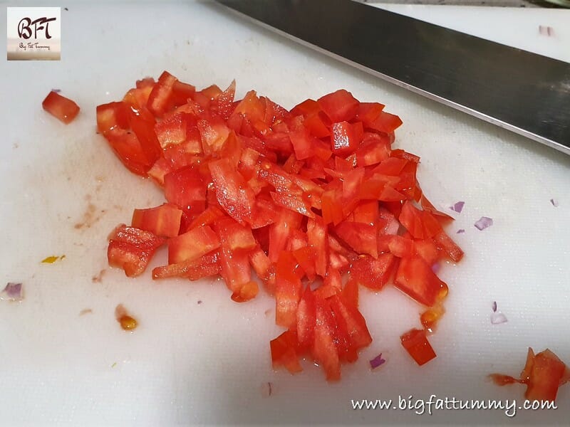 Step 1:     Soak the macaroni and vermicelli for 10 minutes with water just enough to cover it. Deseed the tomatoes and chop as shown in the picture.