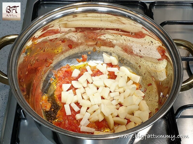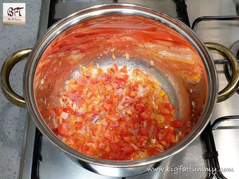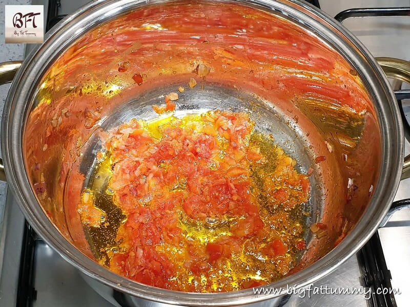 Step 3:     Next add the tomatoes and sauté till they are well fried and ooze oil (see note below).