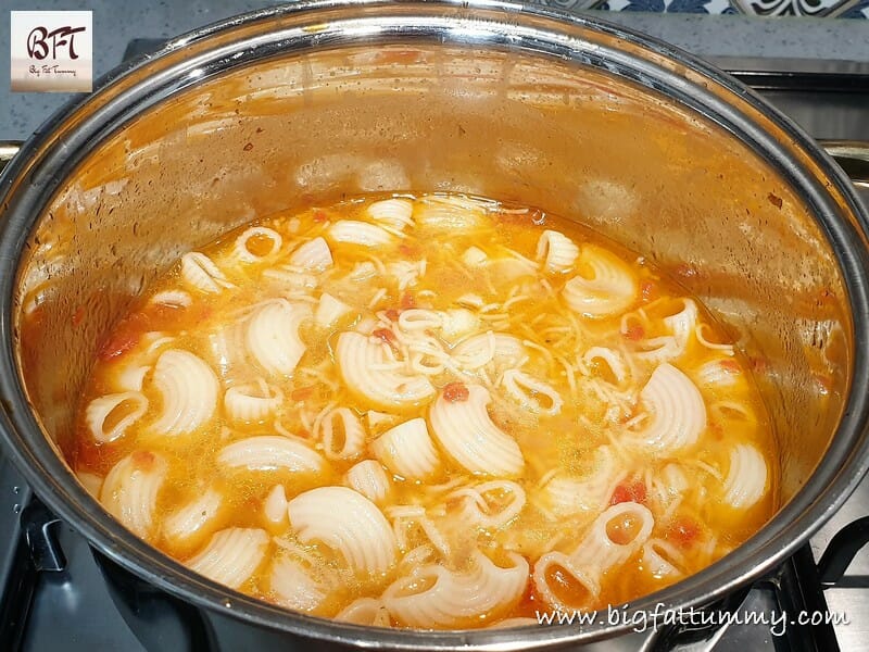Step 6:     Drain and add the macaroni and the vermicelli and check for salt. Add if required. Simmer till the macaroni is done. Serve hot.