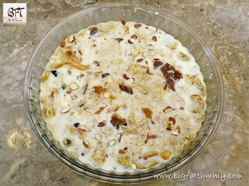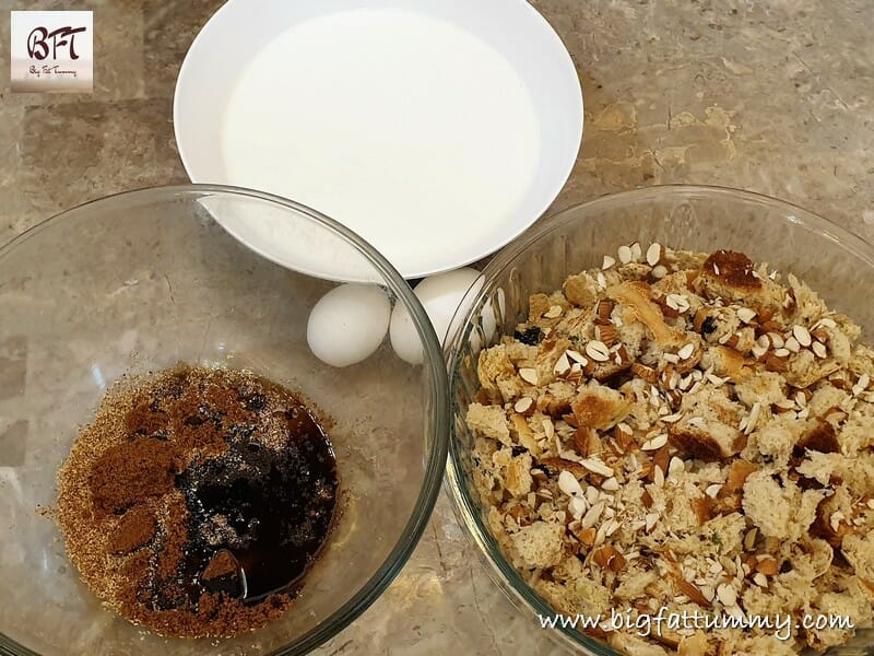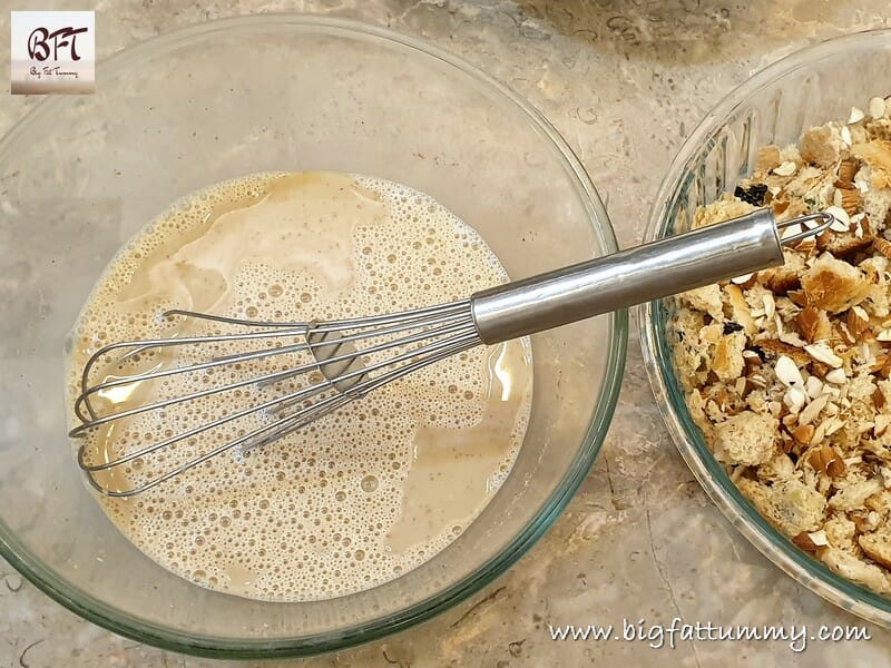 Step 4: Take the sugar, salt, honey and the nutmeg in a mixing bowl and mix well. Add the milk, eggs and vanilla essence and whisk again. Then pour this mixture over the bread in the baking dish.