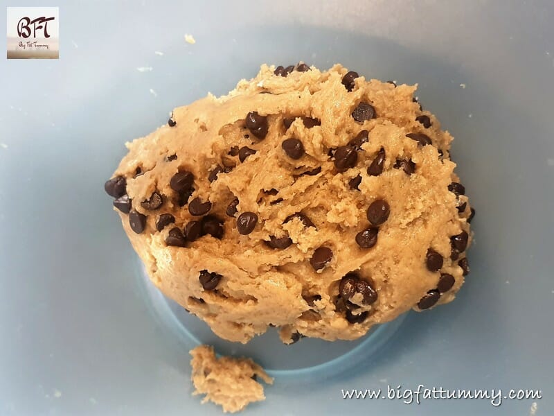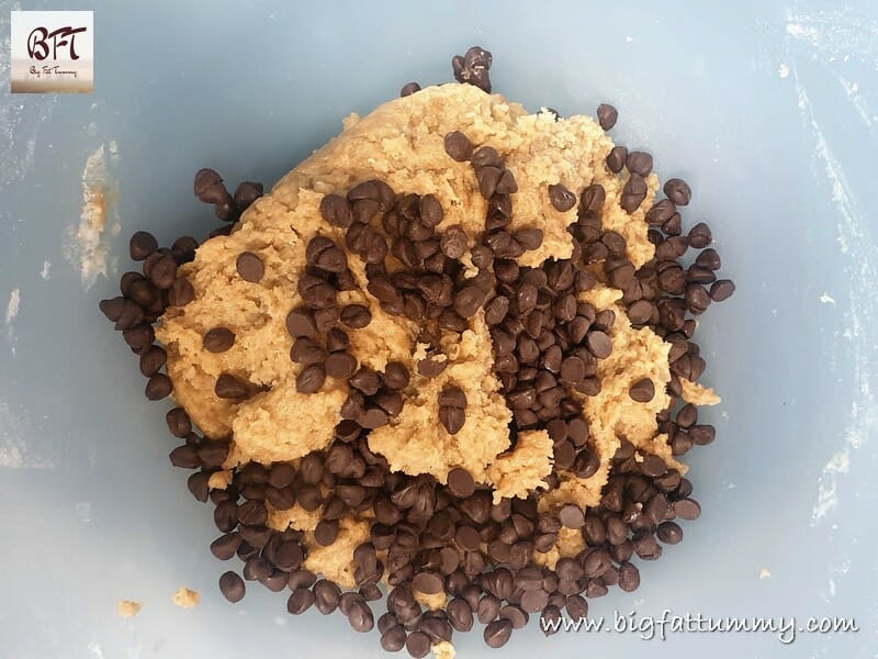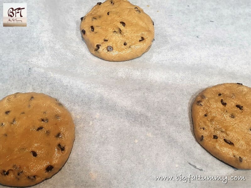 Step 2: Add the chocochips and mix. Divide into three portions (balls) and flatten a bit and place on a tray lined with parchment paper far apart from each other (you can top up with more chips).