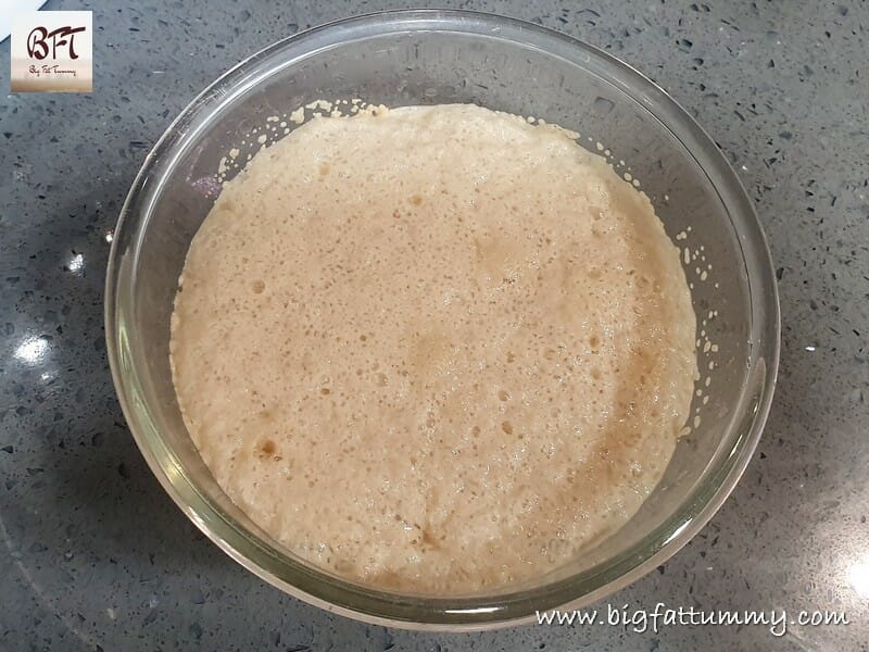 Step 1: Take 150 ml lukewarm water in a bowl (not hot, or the yeast will die). Add the 1 tbsp. of sugar and mix. Then sprinkle the yeast into the bowl. Mix lightly and cover the bowl and keep aside in a warm place till it is frothy (10 minutes or so). The mixture has to be frothy. If it is not, that means your yeast is not active and you cannot use it.