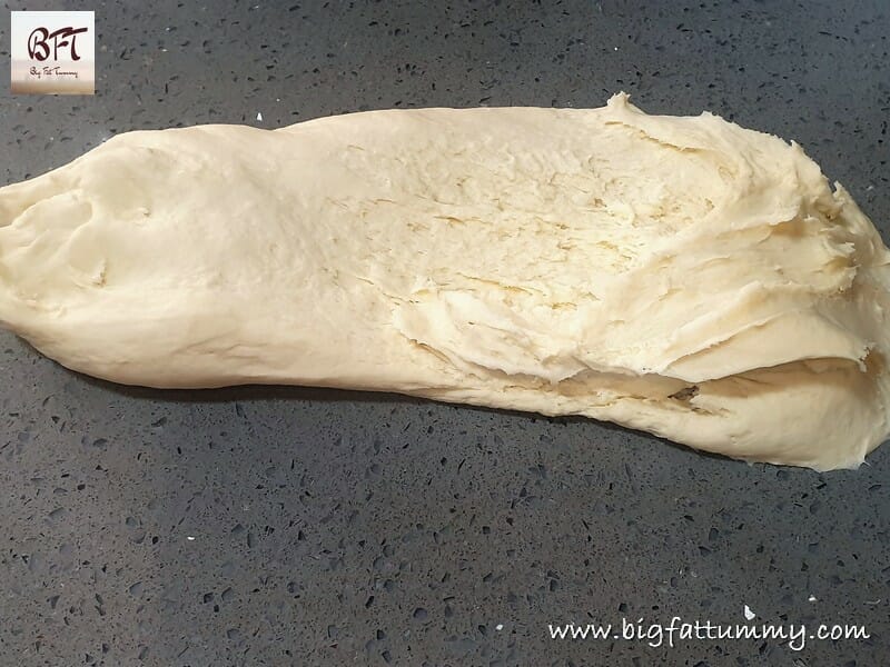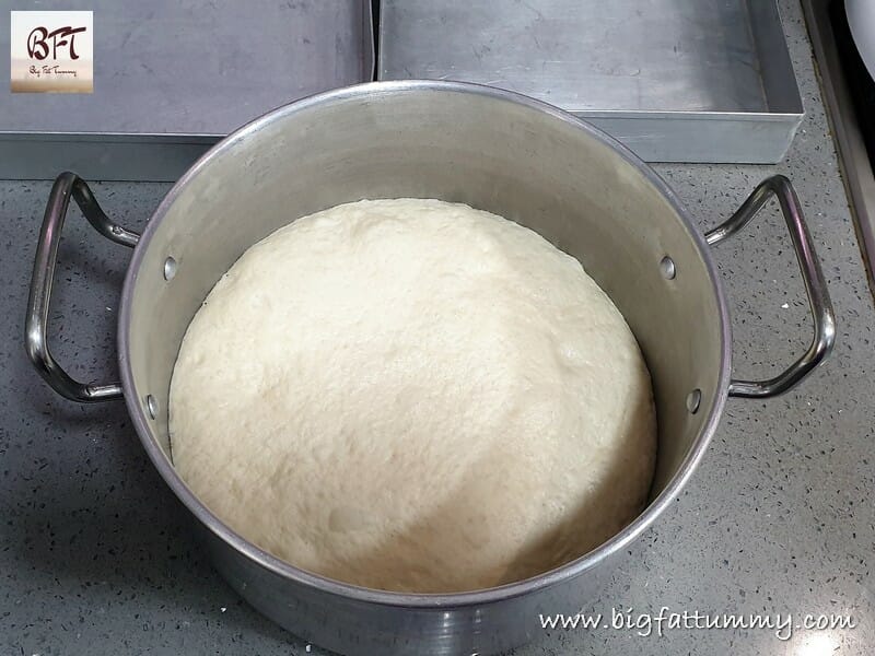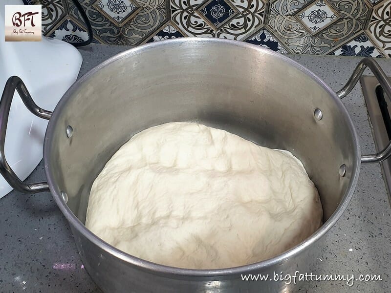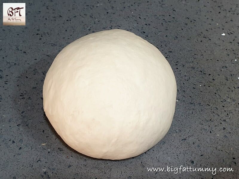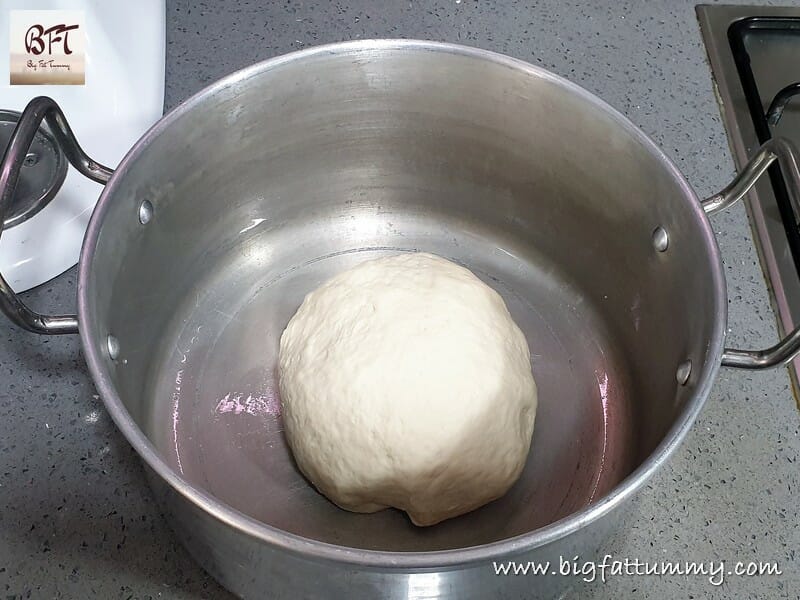 Step 3:     Oil your palms and take the dough out of the mixer bowl. Form a ball and transfer to a large greased bowl / vessel (see tip 2 below). Coat the top of the dough with a very little oil. Cover the dough with a wet cloth or the bowl with cling film and keep aside in a warm place for 2 hours to rise (oil applied to the dough is to prevent the wet cloth or cling film from sticking to it to some extent).