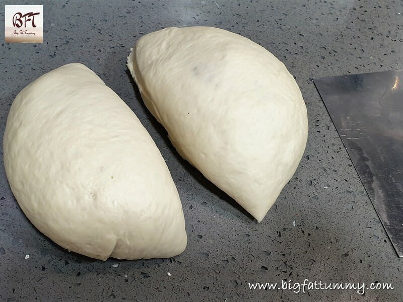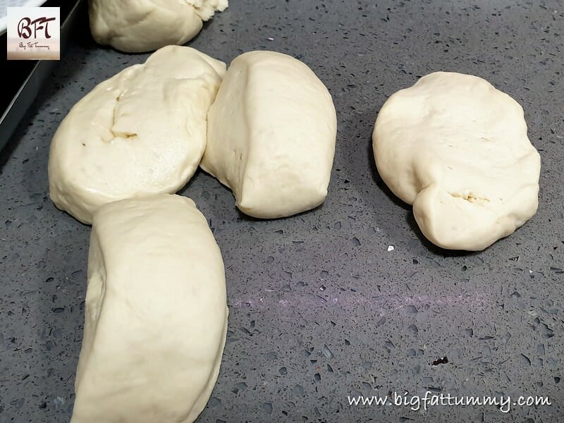 Step 5:     After 2 hours the dough will have risen. Punch the dough (see tip 3 below). Grease your palms with oil and take the dough out of the bowl and transfer to a clean kitchen platform / bench. Then form a ball and divide into 6 to 8 portions (you can weigh the dough and distribute accordingly).