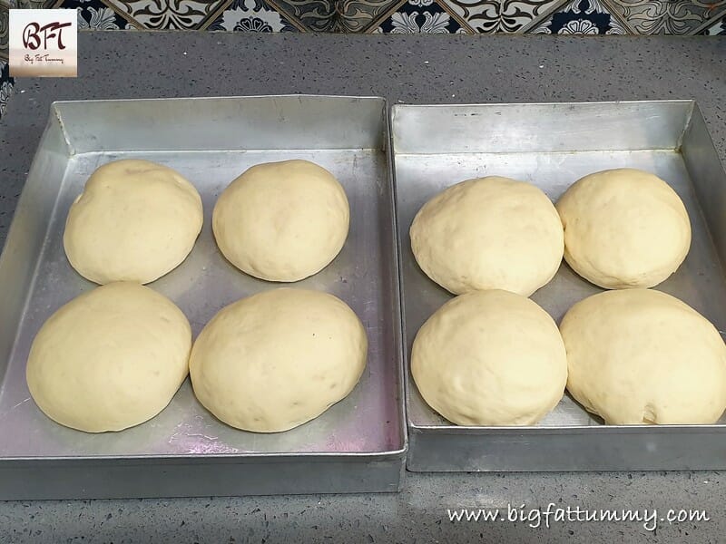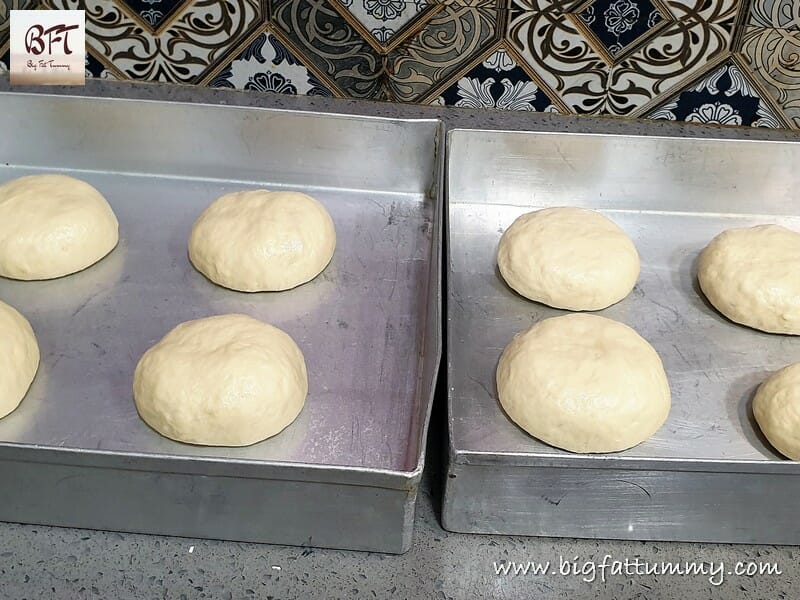Step 6:     Grease your palms with oil, take a portion of the dough and tuck the edges in. Then cup your palms or use your thumb and fingers and roll into a smooth ball. Do this for all the portions and place on the tray leaving 1 inch of space in between them. Allow to proof for a second time, in a warm place, for 2 hours (if you want the pao to be a bit squarish, you can press down lightly on the dough balls at this step – see the picture of the six portion baked pao below).