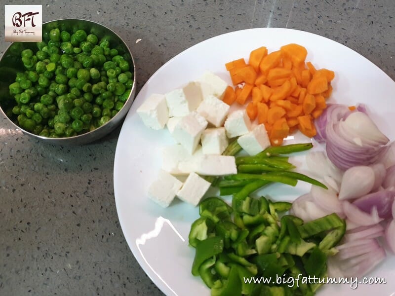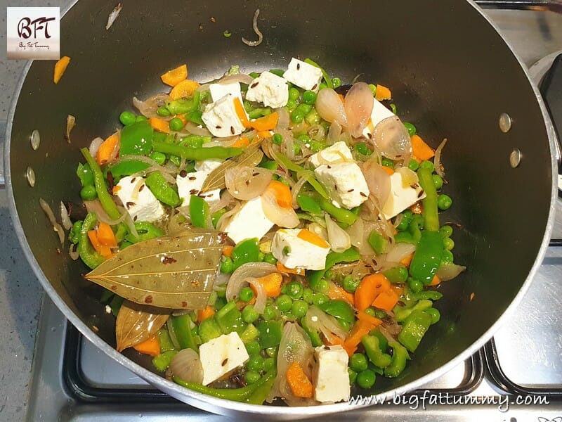 Step 5: Add the ginger-garlic paste and sauté for a minute. Then add the carrots, capsicum and peas and continue to sauté on low heat for a minute. The add the paneer.