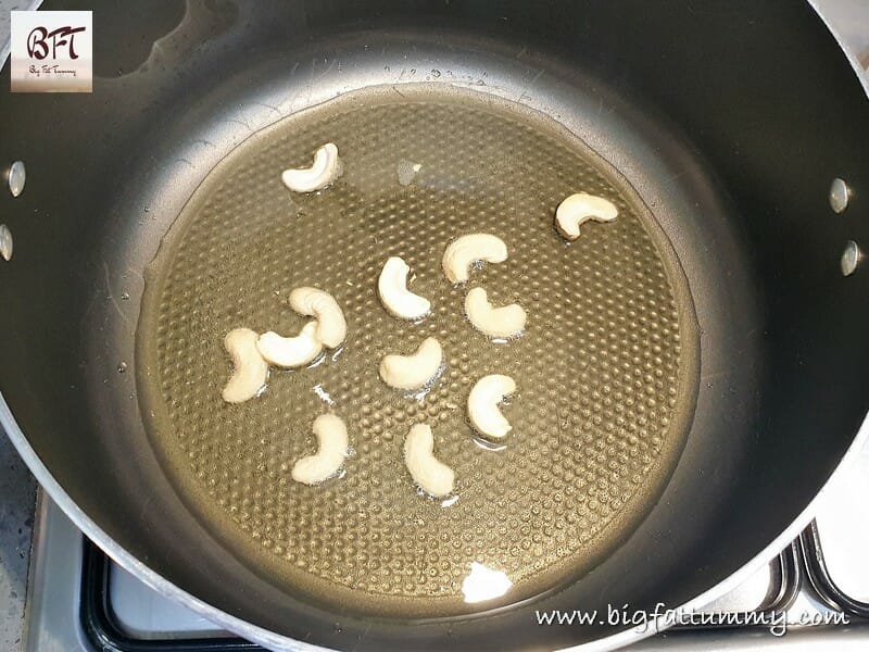 Step 2: Heat the ghee in a heavy bottomed vessel and fry the cashew nuts on low heat till light golden. Then remove and keep aside.