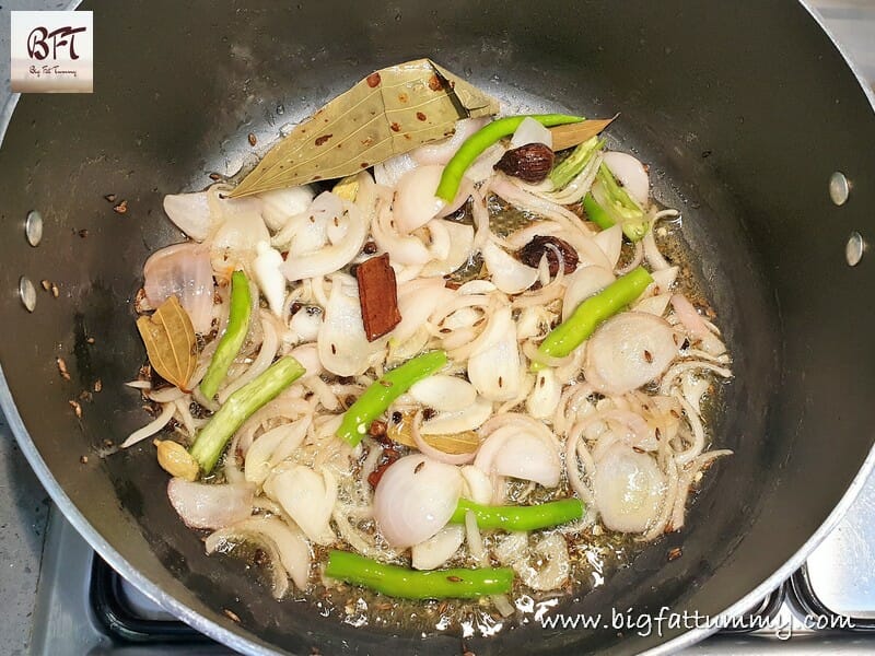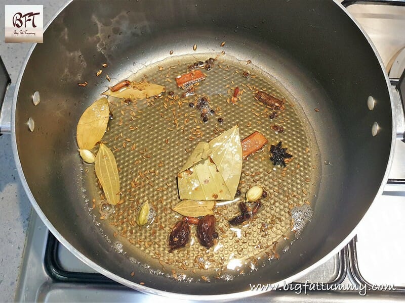 Step 3: Now add the cumin and let it splutter. Then add the bay leaves, black and green cardamom, cloves, star anise and cinnamon and sauté for 30 seconds.