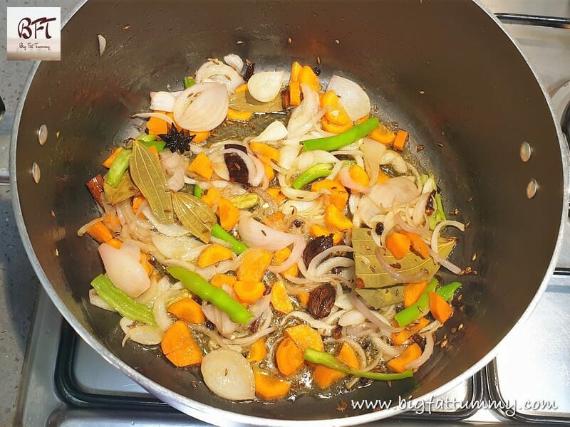 Step 4: Next add the onion and green chillies and sauté till pink.