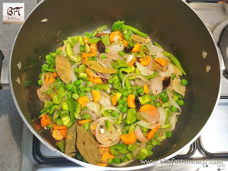 Step 6: Drain the rice and add to the sauted vegetables. Saute for 2 minutes on low heat so as to coat all the rice grains but be gentle so that the rice grains do not break.