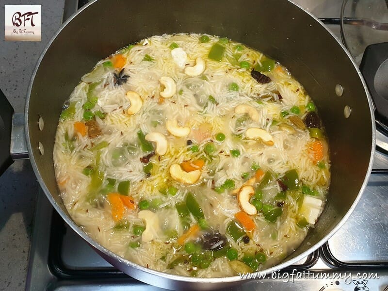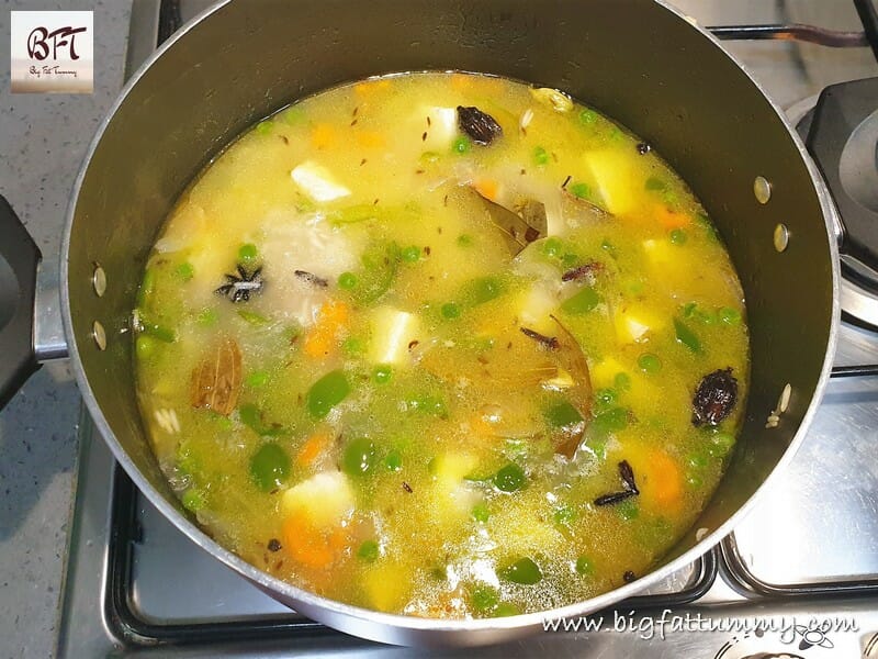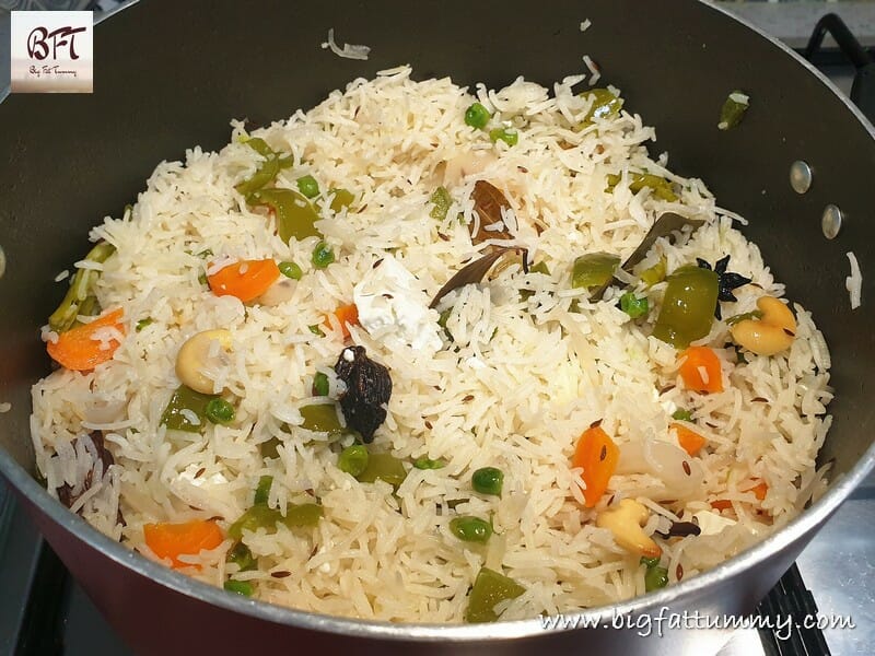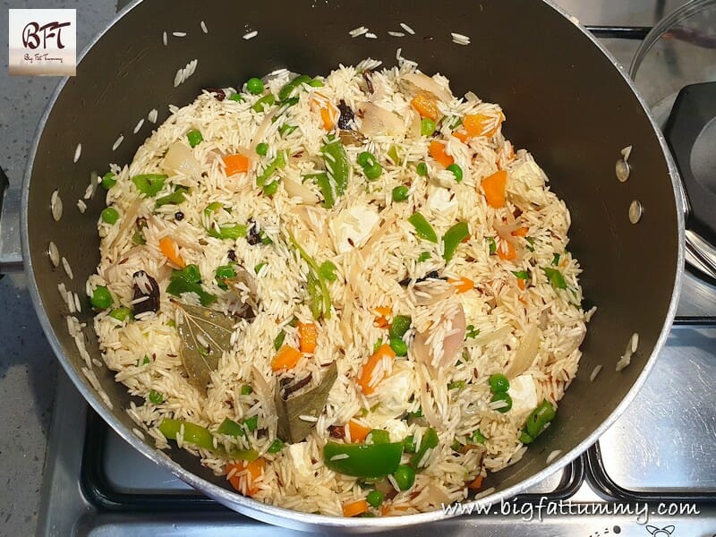 Step 8: Cover the vessel and bring to a boil on high heat. Take off the lid and mix lightly. The cook covered on low heat for 8 to 10 minutes till the rice is cooked. Switch off the heat and when cooled a bit, use a fork to fluff the rice and serve with a Cucumber Carrot Raita (click here) or a Boondi Raita (click here).