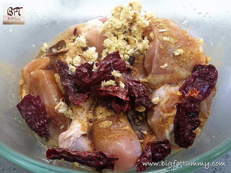 Step 2:     Crush the ginger and garlic to a coarse paste. Then add it to the chicken. Add all the other ingredients also to the chicken and mix well. Leave aside for at least 30 minutes.